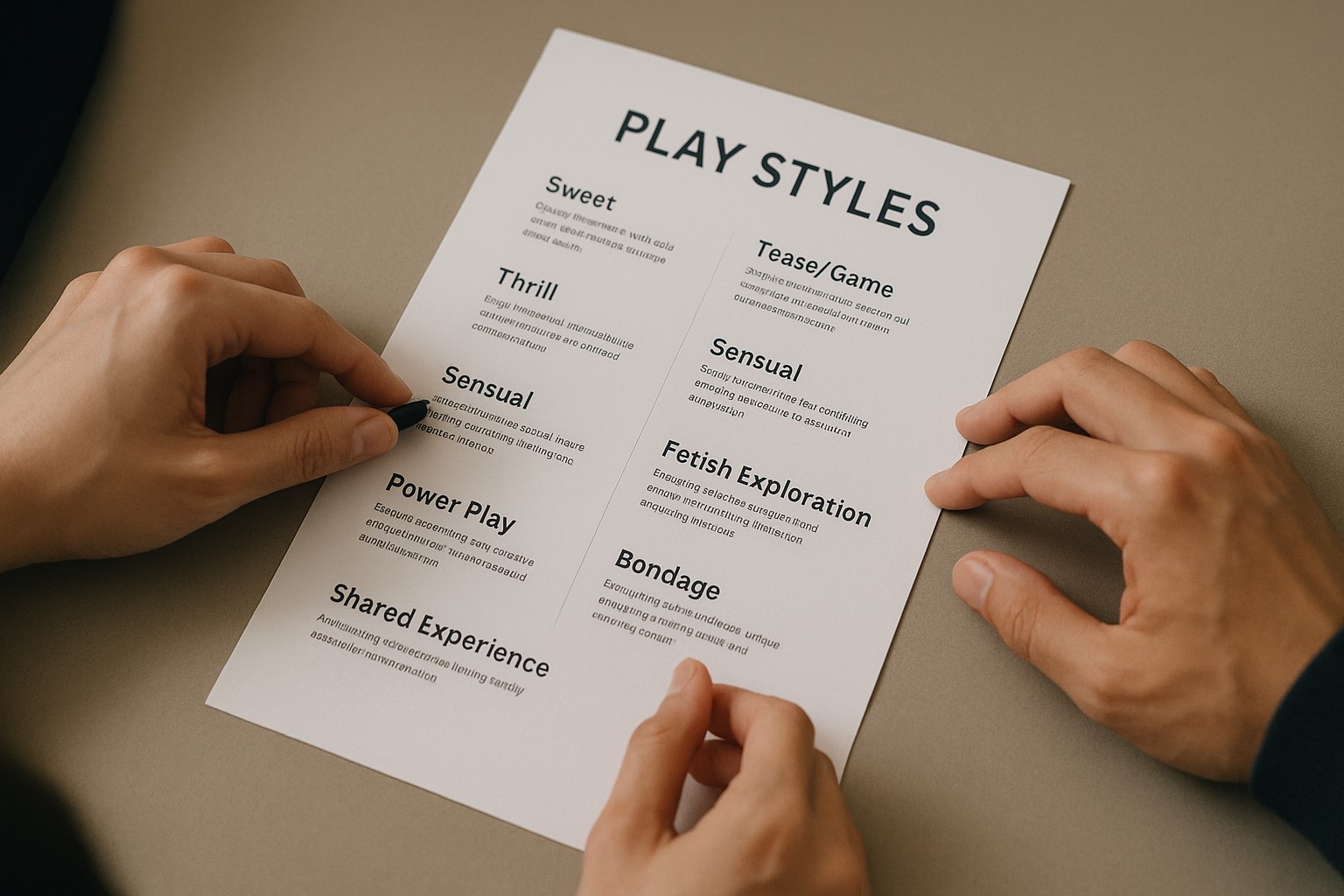 プレイスタイルから探す 2025.10.052025.11.25 あなたの“快感スタイル”を見つけよう。診断を受けなくても、気になるタイプから自由に選べます。 スイート派 やさしさと癒しでとろける愛。抱擁と温もりを大切にするタイプ。 センシュアル派 光・香り・音・質感。五感でとろける雰囲気重視タイプ。 じらし・ゲーム派 心理戦と焦らしで支配する。快感をコントロールするタイプ。 スリル派 背徳の緊張感で高まる快感。リスクを安全に演出するタイプ。 パワープレイ派 支配と信頼の美しいバランス。心理的主導権を楽しむタイプ。 ボンデージ派 ロープが描く静かな支配。動けない自由を感じるタイプ。 フェチ探求派 素材・香り・衣装。自分の“好き”を誇る美意識タイプ。 体験共有派 見る・見られる・共有する。信頼とルールで楽しむ大人の快楽。